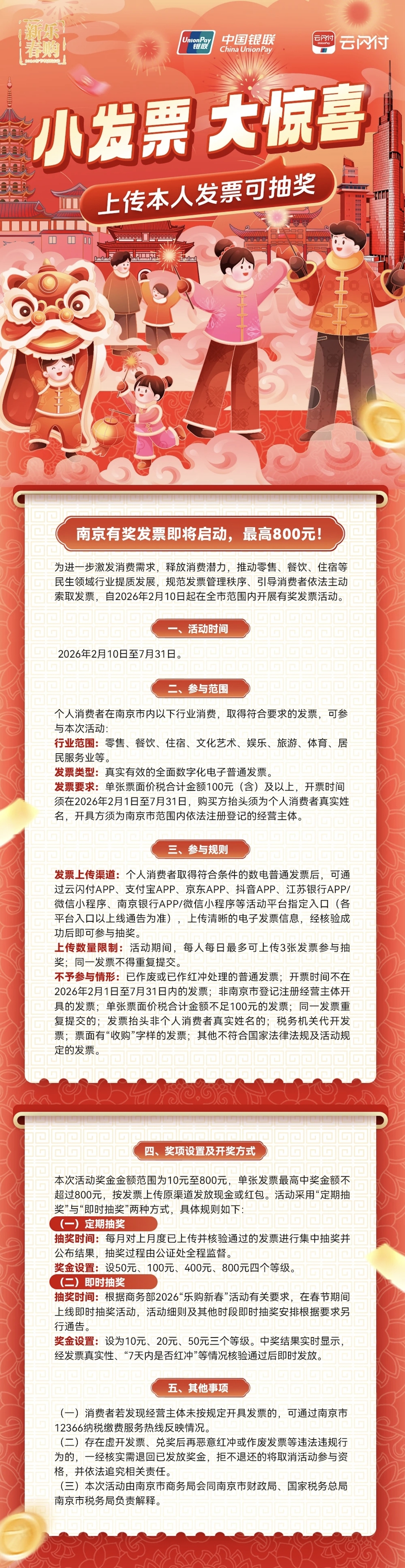 发票要求:单张票面价税合计金额100元(含)及以上,开票时间须在2026年2月1日至7月31日,购买方抬头须为个人消费者真实姓名,开具方须为南京市范围内依法注册登记的经营主体。